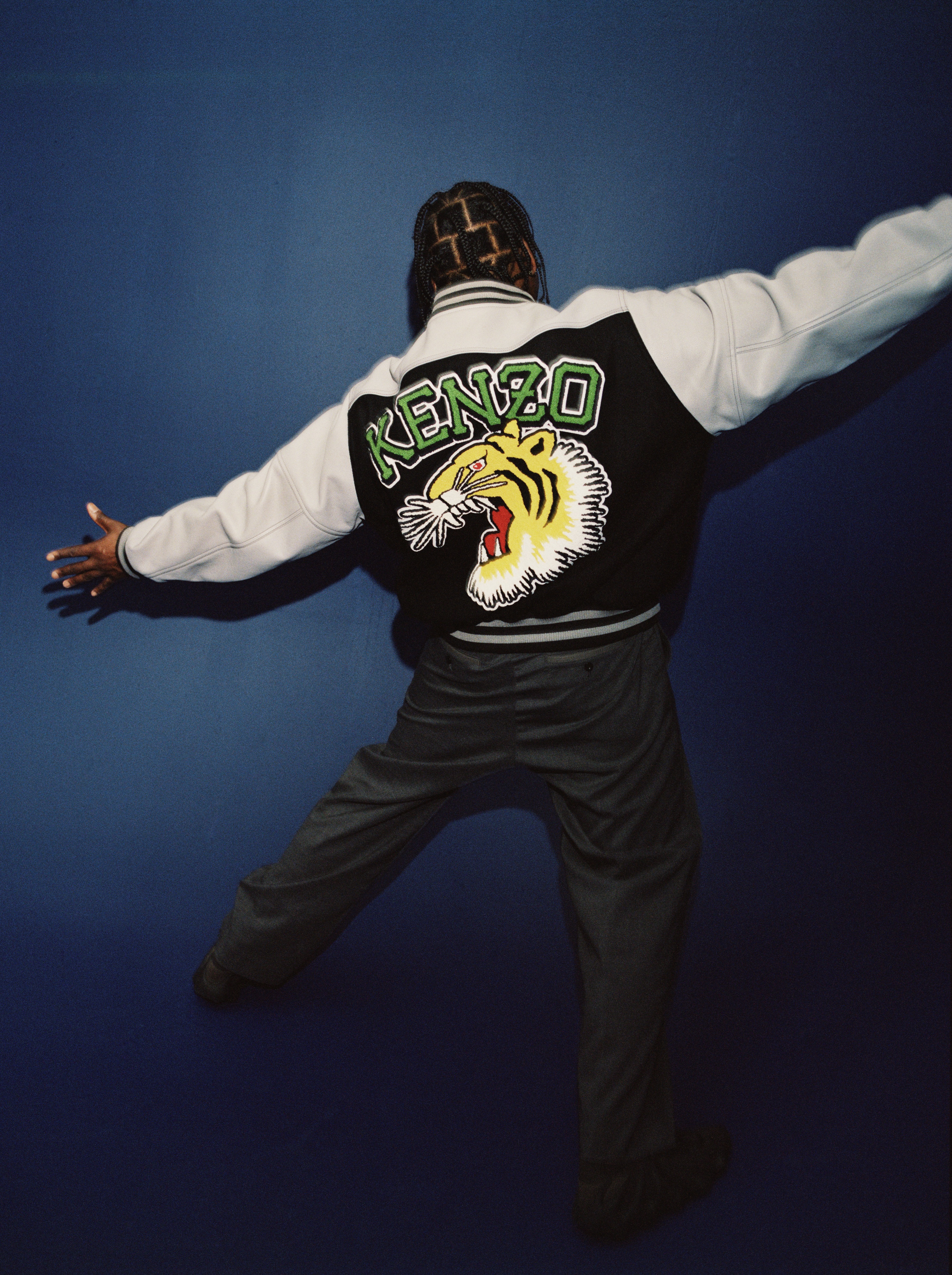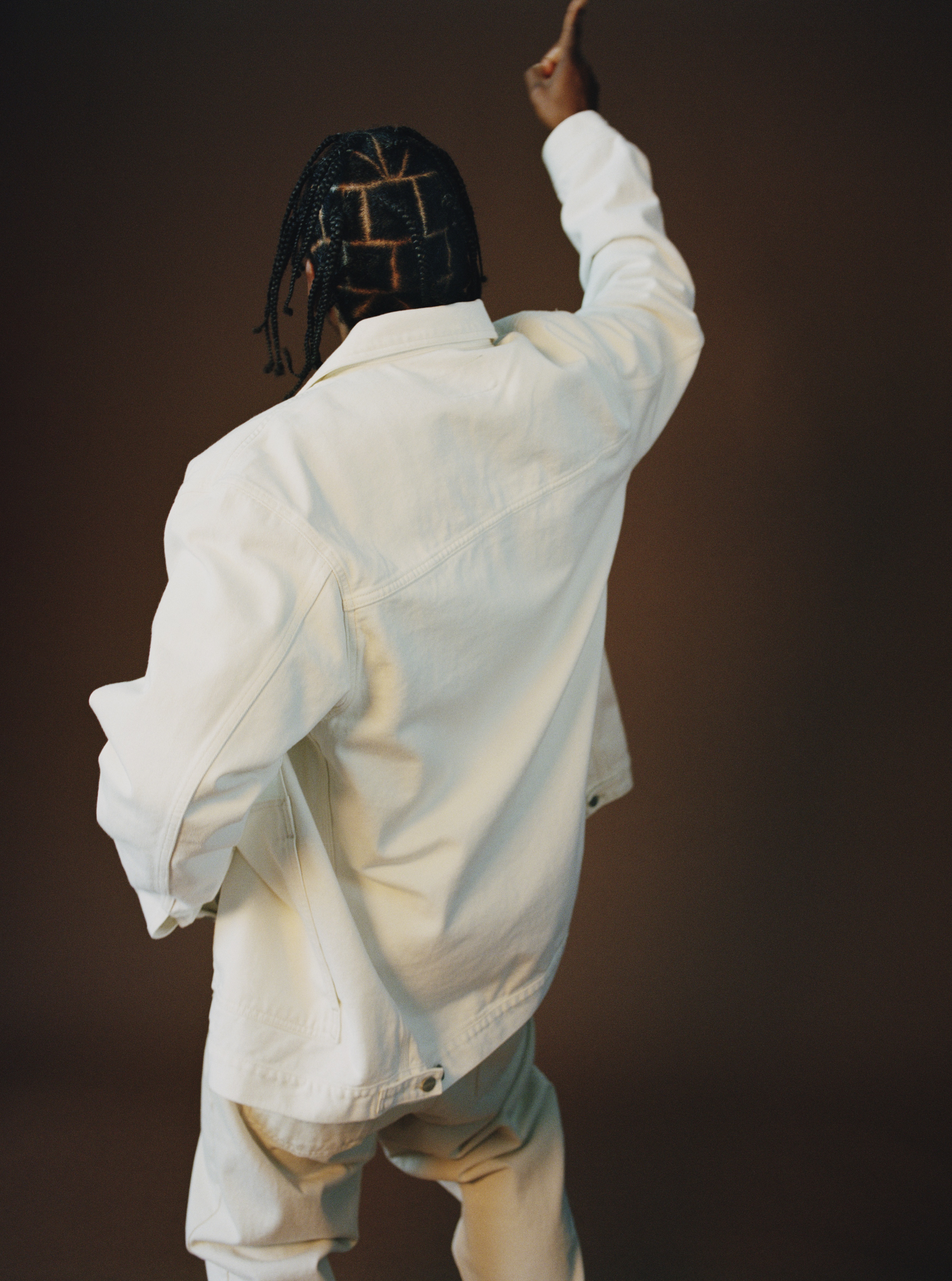 Left: Jacket KENZO, jumpsuit SACAI, shoes YEEZY X ADIDAS. Right: Jacket NOSESSO X LEVI’S, jewelry TALENT’S OWN