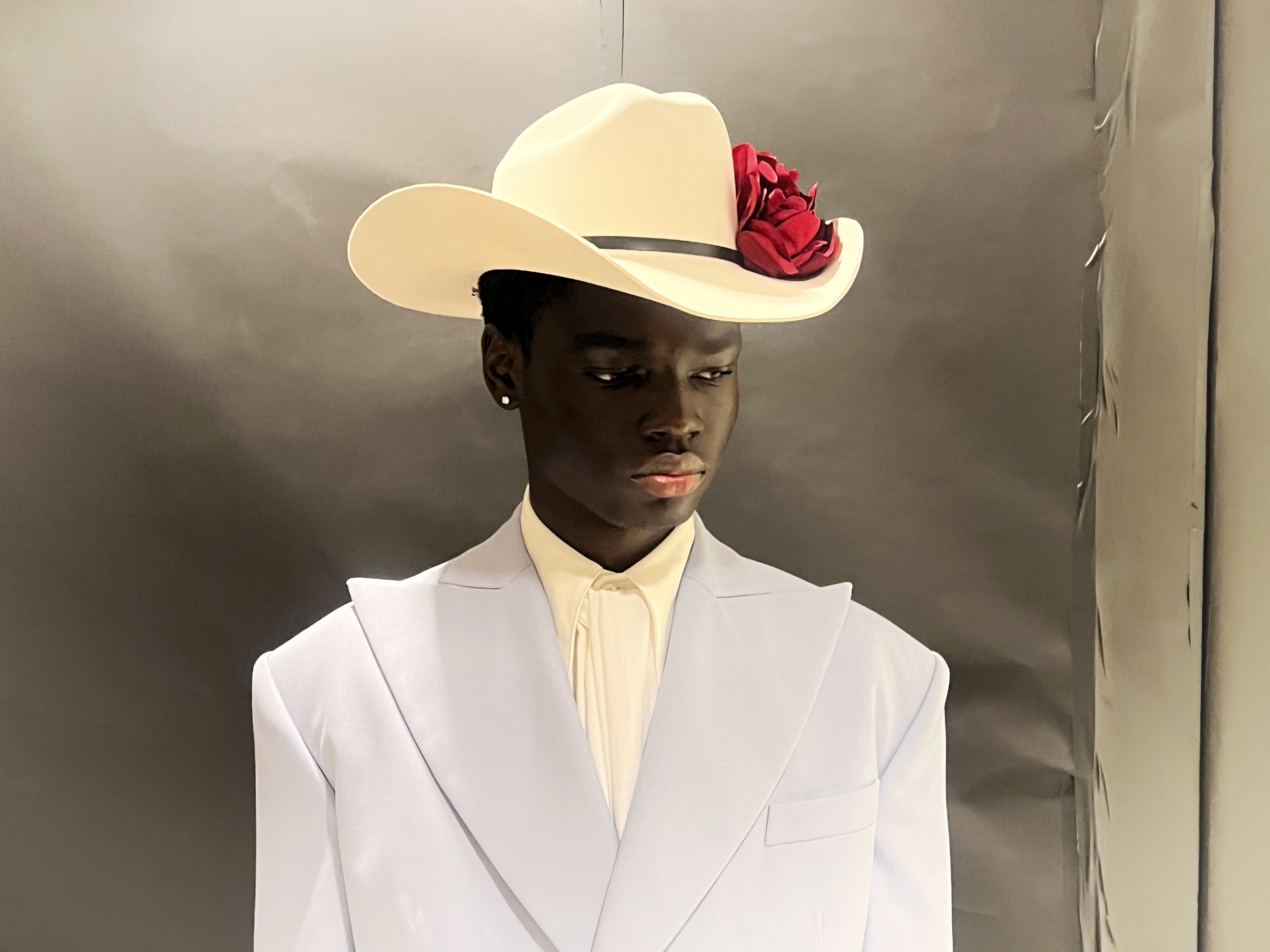 In true Chavarria fashion, the collection and the ambience paid tribute to the designer’s roots and the symbols of his hometown. Rapper and fellow Los Angeles native YG made an appearance among the faces on the runway. Guests were gifted Willy Chavarria-branded flasks of Don Julio Tequila while Latin music played to the backdrop of the elaborate friezes overhead. The collection evoked Willy’s signature references of the zoot suits of the 1930s and 40s paired with paradoxically timeless and nostalgic sculpted hairstyles, as well as intriguing combinations of sportswear and underwear with fine tailoring and elegant Western hats ornamented with roses.